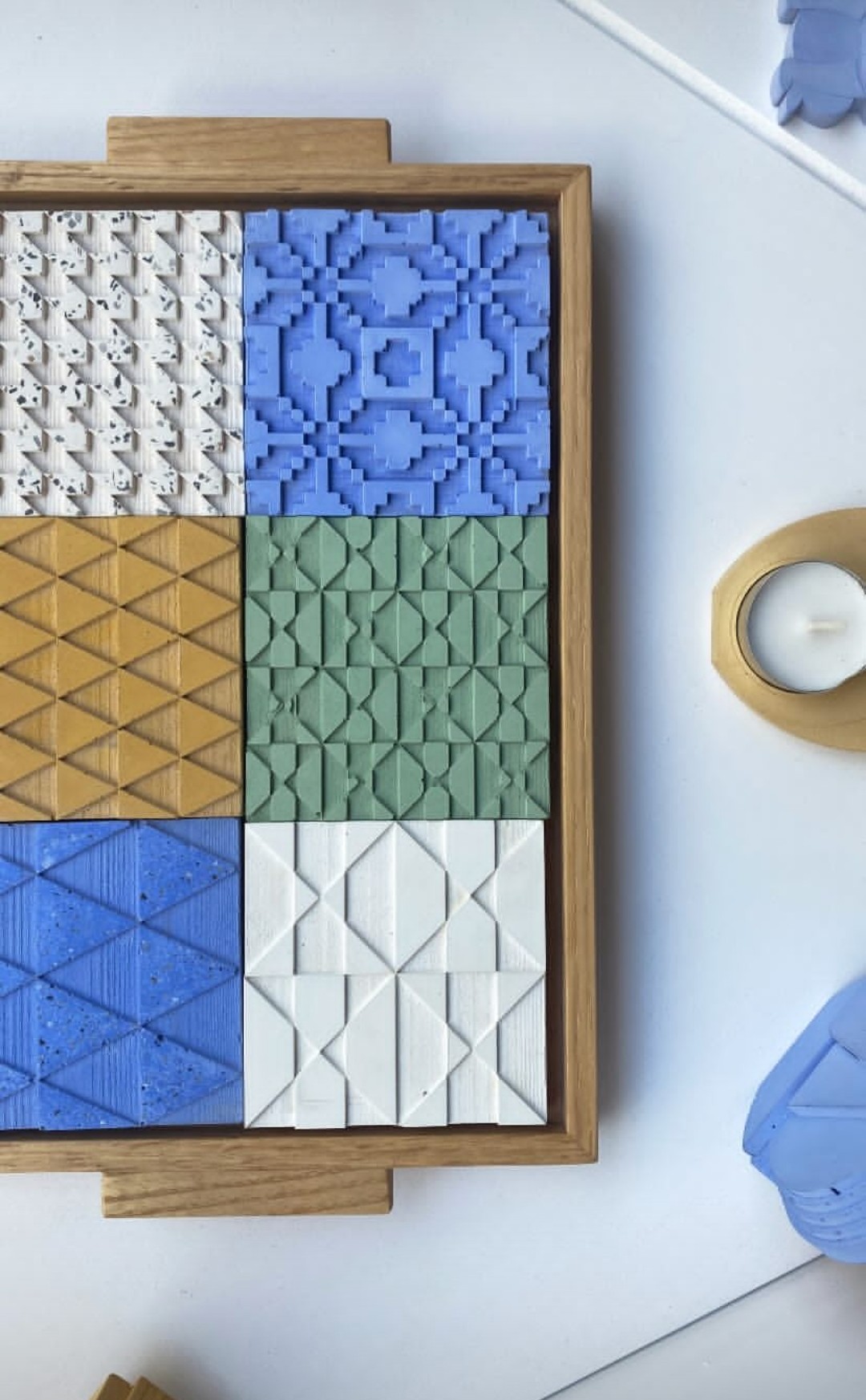 The coasters are designed and manufactured in Chios Island, they are waterproof by dipping them in a hydrophobic solution, and a cork sheet is attached to the back surface to protect the surfaces it comes in contact with.