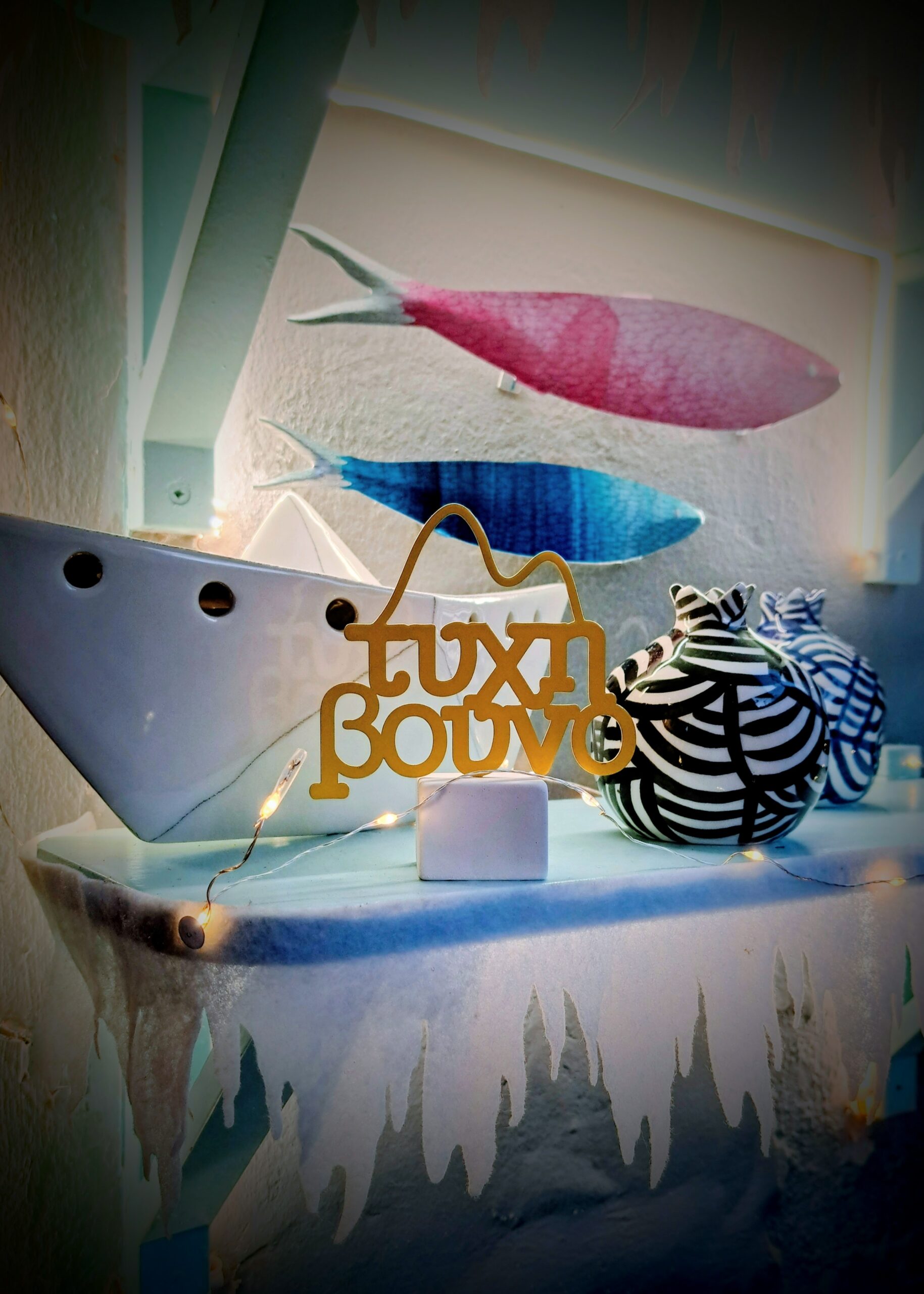 Επιτραπέζιο μεταλλικό διακοσμητικό απο λαμαρίνα με ηλεκτροστατικη βαφή, σε άσπρη βάση απο οικολογική ρητίνη.