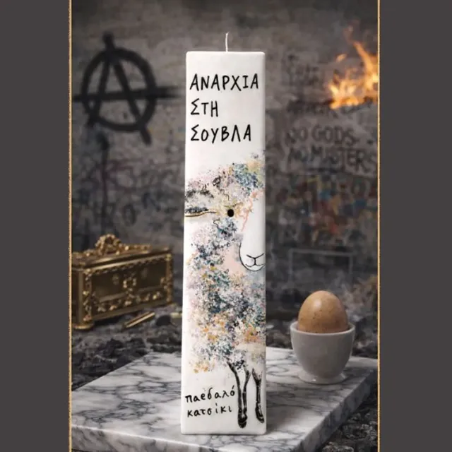 Μοναδική χειροποίητη πασχαλινή λαμπάδα διακοσμημένη με ψηφιακη εκτυπωση με θέμα “Αναρχία ”, ιδανική για ένα όμορφο και ξεχωριστό πασχαλινό δώρο απο 2eggsProject.